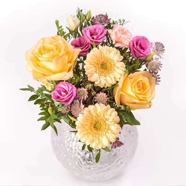 Add a golden edge to everyday life with this lovely bouquet. A beautiful bunch of flowers in shades of apricot and pink that spread a lot of joy.