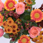 As warm and cosy as an evening in front of the fireplace or a long late summer night outside. The rich orange and yellow shades are the theme of this bouquet. A warm composition of orange germini, roses, hypericum, santini ball, oak leaves and modern eucalyptus.